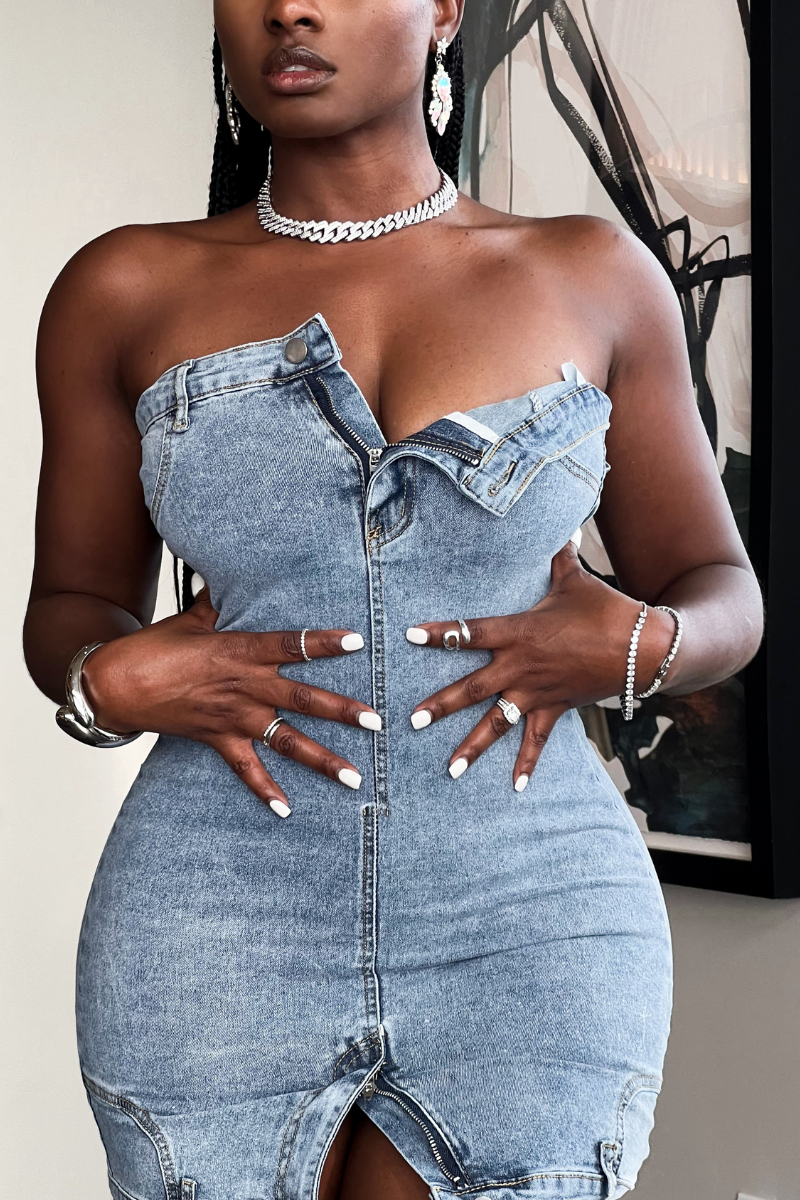 This flattering Denim Tube Dress style will cause everyone to look a you. It emphasizes your curves from the back and adds a touch of uniqueness with the top and bottom zipper and front closures. This denim dress is snug with a mild stretch for comfort. Easy to style with heels or sneakers. Bring Sexy wherever you show up in this dress.